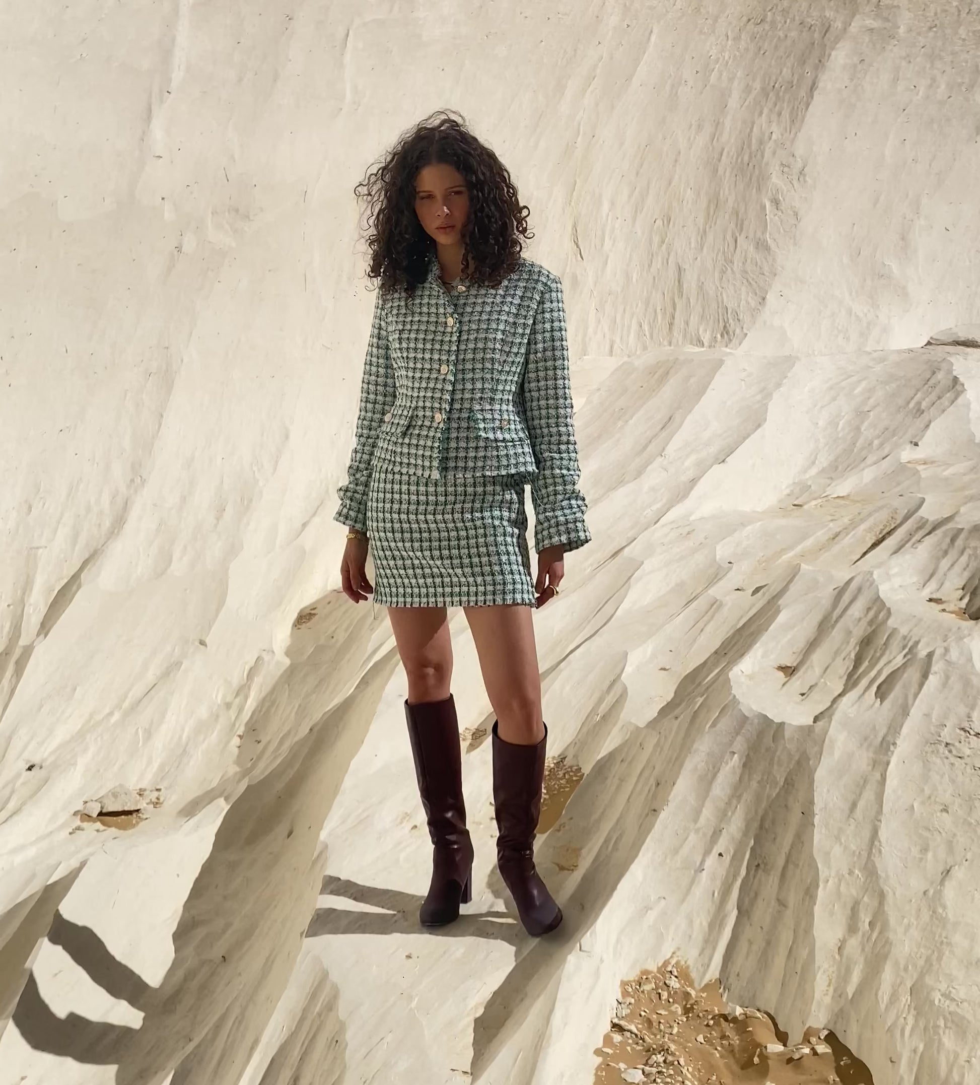 The Green Tweed co-ord layers texture and intention into a look that feels both composed and distinctly contemporary.